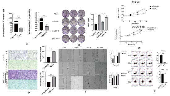 3.7. Upregulating EPHA3 Hindered BLCA Cell Growth, Invasion, Migration, and It Enhanced Their Apoptosis