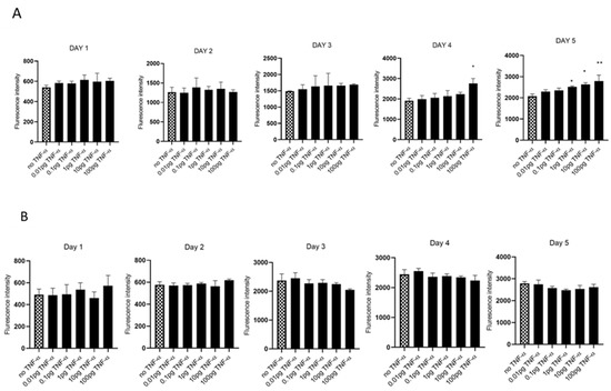 Cell proliferation in response to TNF-α treatment. (A) SW480 and (B) HCT116 cells were treated with doses of TNF-α (0.01–100 pg/mL) over 5 days. Cell proliferation was determined using alamarBlue assay. Data are expressed as fluorescence intensities compared to vehicle control (no TNF-α treatment). Significant difference was calculated using one-way ANOVA followed by Dunnett’s test (GraphPad Prism 8, ** p < 0.01, * p < 0.05). Error bars represent the SEM for six replicates and two independent cultures.