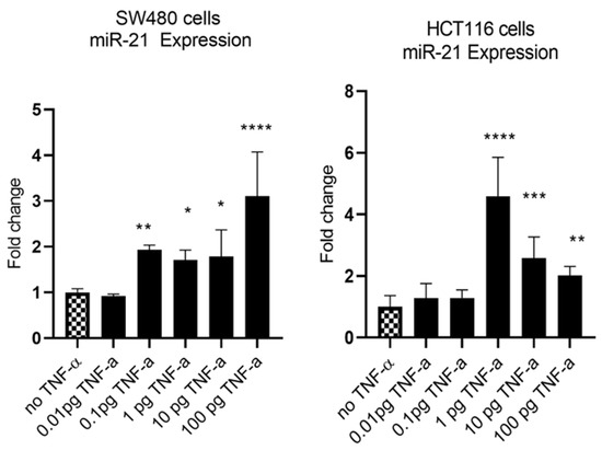 TNF-α effects on miR-21 expression. SW480 and HCT116 cells were treated with 0 to 100 pg/mL of TNF-α for 24 h. MiR-21 expression was measured by RT-qPCR. Data were normalised to expression of U6 RNA and are shown relative to vehicle control (no TNF-α). Significant difference was calculated using one-way ANOVA with Dunnett’s test (GraphPad Prism 8, * p < 0.05, ** p < 0.01, *** p < 0.001, **** p < 0.0001). Data are presented as fold changes of three biological replicates relative to control. Error bars represent the SEM for independent cultures.