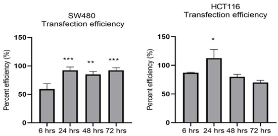 Optimal time for transfection efficiency (TE). FAM dye-labelled synthetic scrambled miRNA control transfected with Lipofectamine RNAiMAX in SW480 and HCT116 cells. Transfected FAM dye-labelled miRNAs was measured by a plate reader at emission 520 nm and excitation 495 nm. Significant difference was calculated using one-way ANOVA with Dunnett’s test comparing to 6 h (the earliest time point) (GraphPad Prism 8, * p < 0.05, ** p < 0.01, *** p < 0.001). Data are presented as a mean percentage of efficiency. Error bars represent the SEM for six replicates and two independent cultures.