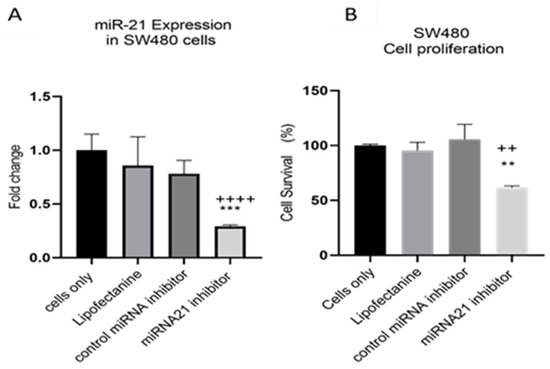 SW480 cells transfected with miR-21 inhibitor. (A) miR-21 expression. Data were normalised to expression of U6; (B) cell proliferation determined using alamarBlue assay after transfection. Cell proliferation assay was performed over 5 days. Significant differences were calculated using one-way ANOVA followed by Dunnett’s test (GraphPad Prism 8). Data are presented as fold changes or percentages of cell survival of treatment groups relative to untreated group (cells only). Statistical comparisons between cells only vs. miR-21 inhibitor (++++ p < 0.001, ++ p < 0.01) and control miRNA inhibitor vs. miR-21 inhibitor (** p < 0.01, *** p < 0.001). Error bars represent the SEM for six replicates and two independent cultures.