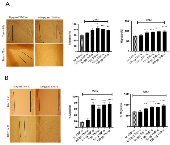 Effects of TNF-α on wound healing in SW480 and HCT116 cells. Wound assays were performed over 72 h using (A) HCT116 and (B) SW480 cells treated with TNF-α (0.01–100 pg/mL). Pictures of wounded cells taken at 0 and 72 h with or without TNF-α treatment (10× magnification). Data are expressed as % compared to vehicle control (no-TNF-α). Significant difference was calculated using one-way ANOVA with Dunnett’s test comparing treated groups to vehicle control (GraphPad Prism 8, ** p < 0.01, *** p < 0.001, **** p < 0.0001). Error bars represent the SEM for three independent cultures.