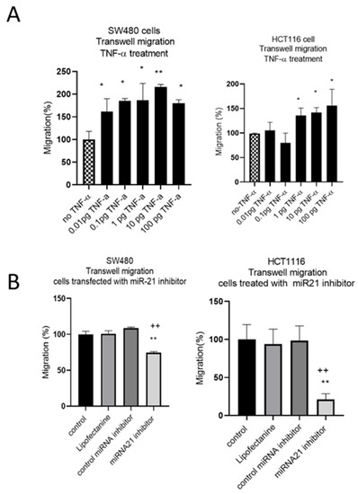 SW480 and HCT116 transwell cell migration (A) cells treated with TNF-α. Error bars represent the SEM for three independent cultures; (B) cells transfected with miR-21 inhibitor. Error bars represent the SEM for six replicates and two independent cultures. Significant differences were calculated using one-way ANOVA followed by Dunnett’s test (GraphPad Prism 8). Statistical comparisons of TNF-α treatment vs. no TNF-α control, control vs. miR-21 inhibitor (* p < 0.05, ** p < 0.01), and control miRNA inhibitor vs. miR-21 inhibitor (++ p < 0.01).
