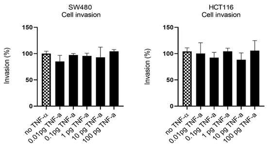 Cell invasion in response to TNF-α treatment in SW480 and HCT116 cells. Cells were treated with a dose range of TNF-α (0.01–100 pg/mL). Cell invasions were determined using transwell Matrigel inserts and alamarBlue assay to assess invading cell numbers. Data are expressed as (%) compared to vehicle control (no TNF-α). Significant difference was calculated using one-way ANOVA followed by Dunnett’s test (GraphPad Prism 8). Error bars represent the SEM for three independent cultures.