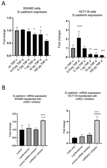 E-cadherin mRNA expression in SW480 and HCT116. (A) E-cadherin expression in cells treated with TNF-α. Error bars represent the SEM for three independent cultures; Statistical comparisons of TNF-α treatment vs. no TNF-α control (* p < 0.05, ** p < 0.01, *** p < 0.001, **** p <0.0001). (B) E-cadherin expression in cells transfected with miR-21 inhibitor. E-cadherin expression was assessed by RT-qPCR. Error bars represent the SEM for six replicates and two independent cultures. Statistical comparisons of control vs. miR-21 inhibitor (**** p < 0.0001), and control miRNA inhibitor vs. miR-21 inhibitor (+++ p < 0.001, ++++ p <0.0001). Significant differences were calculated using one-way ANOVA followed by a Dunnett’s post-test (GraphPad Prism 8).