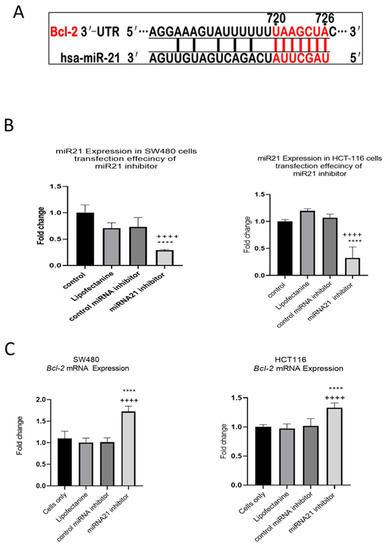 Expression of miR-21 target gene BCL-2 in SW480 and HCT116 cells. (A) The 3′-UTR of BCL-2-mRNA is a target for miR-21 and the matching sequence is marked in red. The miRNA targets were predicted by Target Scan Human Release 6.2 (http://www.targetscan.org) (accessed on 15 September 2022); (B) effect of miR-21 inhibitor on miR-21 expression; (C) effect of miR-21 inhibitor on BCL-2 expression assessed by RT-qPCR. Significant differences were calculated using one-way ANOVA followed by Dunnett’s test (GraphPad Prism 8). Statistical comparisons between cells only vs. miR-21 inhibitor (++++ p < 0.0001) and control miRNA inhibitor vs. miR-21 inhibitor (**** p < 0.0001). Error bars represent the SEM for six replicates and two independent cultures.
