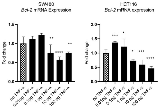 BCL-2 mRNA expression in SW480 and HCT116 cells treated with TNF-α for 24 h. BCL-2 mRNA expression was measured by RT-qPCR. Data were normalised to expression of GAPDH and are shown relative to control (no TNF-α). Statistically significant differences were calculated using one-way ANOVA with Dunnett’s test (GraphPad Prism 8, * p < 0.05, ** p < 0.01, *** p < 0.001 **** p < 0.0001). Error bars represent the SEM for six replicates and two independent cultures.