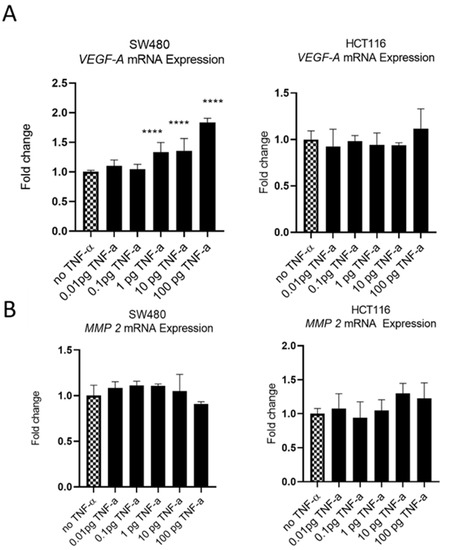 VEGF-A (panel (A)) and MMP 2 (panel (B)) mRNA expression in response to TNF-α treatment in SW480 and HCT116 cells. Cells were treated with a dose range of TNF-α (0.01–100 pg/mL). Data are expressed as a fold change compared to vehicle control (no TNF-α). Significant difference was calculated using one-way ANOVA followed by Dunnett’s test (GraphPad Prism 8, ****p < 0.0001). Error bars represent the SEM for six replicates and two independent cultures.