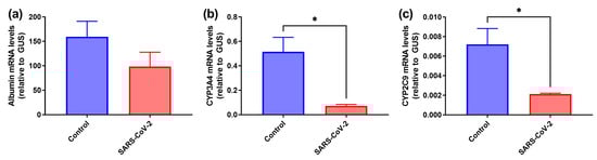 3.3. SARS-CoV-2 Induces Decrease in Expression of Hepatocyte-Specific Markers in HepaRGdiff Cells