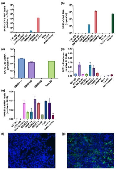 - Bielarz, V.; Willemart, K.; Avalosse, N.; De Swert, K.; Lotfi, R.; Lejeune, N.; Poulain, F.; Ninanne, N.; Gilloteaux, J.; Gillet, N.; et al. Susceptibility of neuroblastoma and glioblastoma cell lines to SARS-CoV-2 infection. Brain Res. 2021, 1758, 147344. [Google Scholar] [CrossRef]