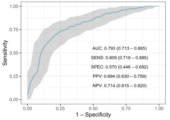 ROC-curve for Random Forest trained on NST-criteria group. (ROC—receiver operating characteristic curve, AUC—area under the curve, SENS—sensitivity, SPEC—specificity, PPV—positive predictive value, NPV—negative predictive value).