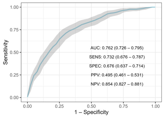 ROC-curve for XGBoost trained on total study population. (ROC—receiver operating characteristic curve, AUC—area under the curve, SENS—sensitivity, SPEC—specificity, PPV—positive predictive value, NPV—negative predictive value).