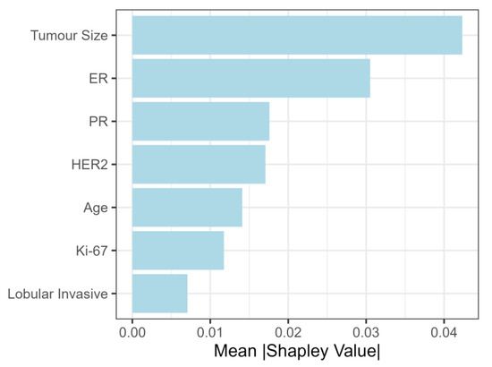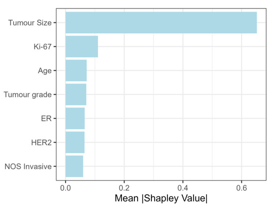 While tumor size was also the most important feature when Shapley values were calculated on the total study population, the second most important feature was Ki-67, followed by age and tumor grade (Figure 6).