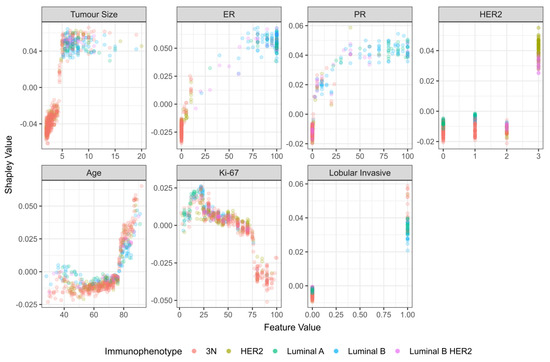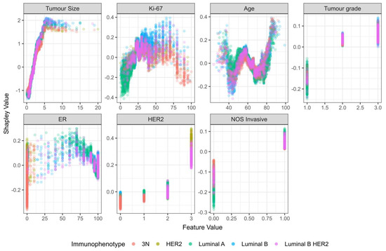 While tumor size was also the most important feature in the total study population, it was shown that the second most important feature was Ki-67, followed by tumor grade. Interestingly, when Shapley values for patient age were calculated on the total study population, a non-linear trend was observed, where both patients younger than 40 and patients older than 75 were associated with nodal involvement. This higher occurrence of lymph node metastasis in patients younger than 40 was also reported in previous studies [43,44]. Concerning Ki-67, higher values are generally associated with higher probabilities for metastasis. Interestingly, for Ki-67 values > 75%, Shapley values are mostly negative. However, when accounting for immunophenotype, this trend reversal is only visible for triple-negative carcinomas. Previous studies also showed that Ki-67 > 20% was positively correlated with lymph node metastasis, albeit they used pre-defined categories of <20% and >20% and did not account for differences in immunophenotype [45,46]. Hence, they potentially missed a more complex relationship that was explained through Shapley values.