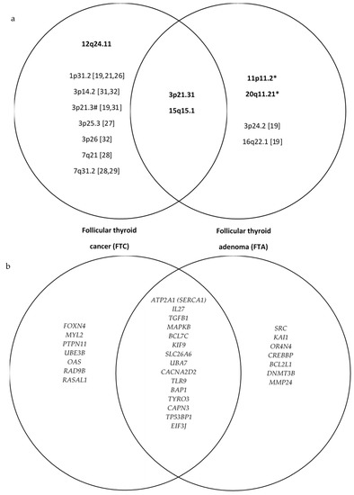(a) The overlapping chromosomal regions with loss of heterozygosity in follicular thyroid cancer (FTC) and follicular thyroid adenoma (FTA). The first set shows LOH present only in follicular thyroid cancer, the second both in FTC and FTA, and the third shows LOH present only in FTA. Findings from the present study are in bold. Other regions (not in bold) were found in the literature [19,21,26,27,28,29,30,31,32]. (b) The most important genes included in overlapping chromosomal regions with loss of heterozygosity in follicular thyroid cancer (FTC) and follicular thyroid adenoma (FTA). * represents statistical significance at p < 0.05; # represents regions present only in FTC or in both FTC and FTA (the latter in our study).