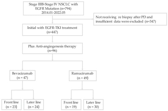A total of 96 patients with advanced-stage EGFR-mutant NSCLC, who received EGFR-TKI (gefitinib, erlotinib, afatinib, dacomitinib, or osimertinib) as first-line therapy and an AAT (bevacizumab or ramucirumab) in any treatment line, were enrolled in this retrospective study. The patients’ records were reviewed at the China Medical University Hospital, a tertiary referral center in Taiwan, between January 2014 and May 2022. The study was approved by the institutional ethics committee of the relevant institution (IRB number: CMUH110-REC1-244), and informed consent was waived due to the retrospective nature of the study. We staged patients based on the American Joint Committee on Cancer, 8th edition staging system. Only stage IIIB–IV patients were enrolled in the final analysis. Patients were excluded for the following criteria: did not receive at least three cycles of AAT treatment; did not undergo re-biopsy after the progression of disease; and had insufficient data for analysis. The recorded data from electronic records included patients’ baseline data (age, sex, smoking status, Eastern Cooperative Oncology Group Performance Status (ECOG PS)), lung cancer status (tumor–node–metastasis (TNM) stage at initial diagnosis, the pattern of distant metastases, EGFR mutation subtype, T790M status after disease progression), and treatment condition (first-line treatment, subsequent treatment, treatment-related adverse events, and treatment duration).