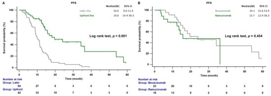 (A) PFS of patients with EGFR-mutant NSCLC receiving front-line and later-line therapy. (B) PFS of patients with EGFR-mutant NSCLC treated with front-line bevacizumab or ramucirumab combination therapy. EGFR, epidermal growth factor receptor; PFS, progression-free survival.