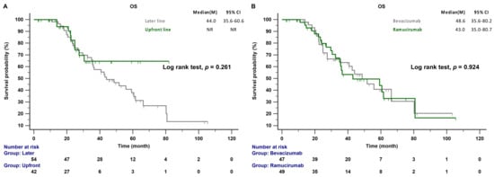 The median follow-up time was 47.4 months (range 39.7–60.9 months); 44 of the 96 patients (45.8%) died during this period. The median PFS of patients receiving AAT as a front-line combination therapy was significantly longer than that of patients receiving AAT as a later-line combination treatment (19.6 vs. 10.0 months; p < 0.001; Figure 2A). There was no significant difference in the median PFS between patients receiving EGFR-TKI combined with bevacizumab and those receiving EGFR-TKI combined with ramucirumab (24.1 vs. 15.7 months, p = 0.454; Figure 2B). The median OS was not reached in the front-line treatment group, whereas it was 44.0 months in the later-line treatment group (p = 0.261; Figure 3A). No significant differences in OS between patients receiving bevacizumab and those receiving ramucirumab were observed (48.6 vs. 43.0 months, p = 0.924; Figure 3B). The incidences of proteinuria, hypertension, and bleeding, the most common adverse events of AATs, were 19.8%, 14.6%, and 4.2%, respectively. The incidences of adverse events were similar between systemic therapy plus bevacizumab and ramucirumab. However, the incidences of treatment-related hepatitis and bleeding were higher, although not significantly, in the EGFR-TKI plus bevacizumab group than in the EGFR-TKI plus ramucirumab group (19.1% vs. 6.1%, p = 0.055; 8.5% vs. 2.1%, p = 0.156; respectively). There were no treatment-related deaths in this study (Table 2).