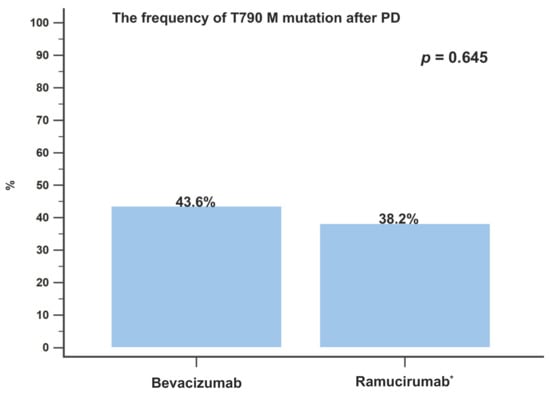 The incidence of T790M mutation development after disease progression in patients treated with bevacizumab or ramucirumab combination therapy. PD, progressive disease. * Patients treated with osimertinib were excluded.