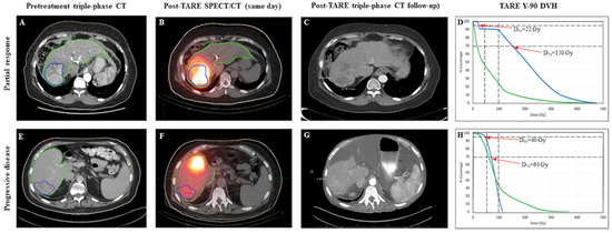 Cases of partial response (PR; top row) and progressive disease (PD; bottom row). Gross tumor volume is delineated in blue and liver volume in green on pretreatment diagnostic imaging (Panel (A,E)) and post-Y90 same day SPECT (Panel (B,F)). Follow up imaging shows areas of necrosis within the treated volume for the responder (Panel (C)), and new tumor growth in the non-responder (Panel (G)).