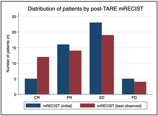 The mean time from TARE to initial mRECIST assessment was 87 days (range 40–136 days). After the initial post-TARE assessment, mRECIST scores improved on subsequent studies for 12 patients (Figure 3). In that group, five patients characterized with SD at 3-month follow-up subsequently developed CR, three patients with initial PR later were classified with CR, two patients with initial SD went on to develop PR, and two patients with PD were downstaged to SD. Mean time from TARE to best mRECIST score was 188 days (range 40–799 days). The best observed mRECIST OR was achieved after 27 of the 51 procedures (53%), with 23.5% (n = 12) demonstrating CR and 29.4% (n = 15) demonstrating PR. The 24 non-responders included 20 patients with SD (39.2%) and four with PD (7.8%).