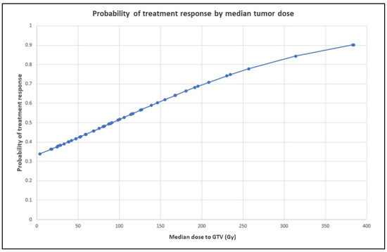 Probability of treatment response by median tumor dose. The graph shows an approximately linear relationship, with 90% tumor response probability at GTV dose > 350 Gy. Probabilities at various levels of the independent variable were derived from logistic regression odds ratios.