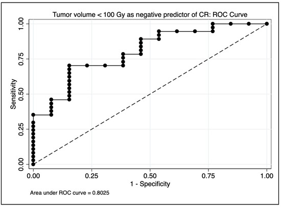 On multivariate logistic regression evaluating associations with mRECIST and CR, only tumor volumes receiving less than 100 Gy preserved significance (p = 0.0009 and p = 0.0004, respectively). The median volume of tumor receiving less than 100 Gy for those achieving CR was 17 cc (range 0–81), for PR 65 cc (range 21–461), for SD 86 cc (range 22–878), and for PD 117 cc (33–770). Tumor volume itself did not correlate significantly with mRECIST (p = 0.09) or CR (p = 0.12) on UVA or MVA. GTV < 100 Gy achieved an AUC estimate of 0.80 as a negative predictor of CR on ROC analysis (see Figure 5). On multivariate logistic regression evaluating associations with objective response (CR + PR), only dosimetric parameters D70 (p = 0.038), D95 (p = 0.049), conformity index (p = 0.021), and HTOF (p = 0.020) preserved significance. D98 (p = 0.064) trended toward significance. Responders received a significantly higher D70 radiation dose (median = 95 Gy, range 44–295 Gy) than non-responders (median = 60 Gy, range 2–187 Gy), with p = 0.042 by one-sided ANOVA.