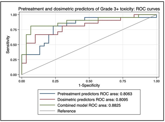 Area under the curve (AUC) estimate for predicting complete response on receiver operating characteristic (ROC) analysis. A combined multivariate model using only baseline bilirubin level and mean dose to non-tumorous liver achieved an AUC estimate of 0.88 as a predictor of ≥grade 3 toxicity.