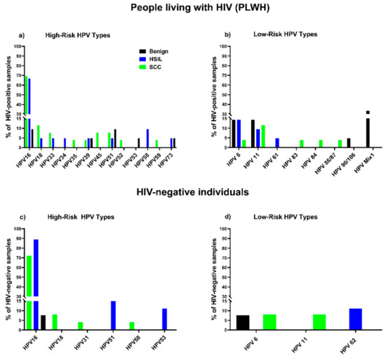 Consistent with the above, we found that the frequency of non-16 HR HPV types were higher in HSIL and SCC from PLWH versus HIV-negative patients. Therefore, non-16 HR HPV genotypes are more strongly affected by immunological deficiency than HPV 16, as has been reported by others [29,35].