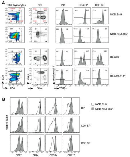 Representative flow cytometry profiles of thymocytes from leukemic NOD.Scid.Il15−/− and C57BL/6.Scid.Il15−/− and control NOD.Scid and C57BL/6.Scid mice. (A) Profile of thymocyte subsets based on CD4 and CD8 expression (first column) and the DN subsets based CD25 and CD44 expression (second column). Histograms (last 3 columns) show TCRβ expression in CD4 SP, CD8 SP and DP subsets. (B) Expression levels of CD24, CD27, CXCR4 and CD117 in CD4 SP, CD8 SP and DP subsets from NOD.Scid (unfilled histogram) and leukemic NOD.Scid.Il15−/− (gray histogram) mice.