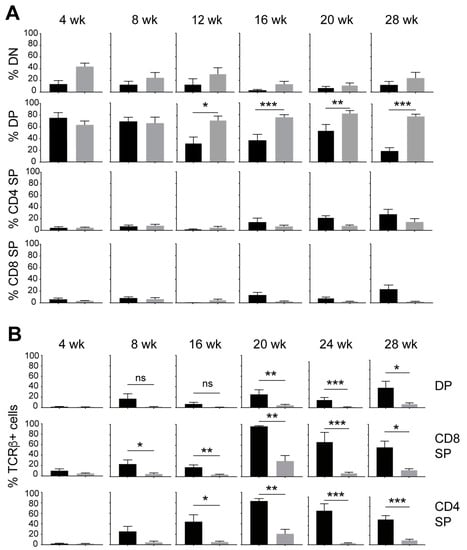IL-15 deficiency in NOD.Scid mice causes an increase in the proportion of DP thymocytes while decreasing TCR-positive cells. (A) Frequency of DN (CD4−CD8−), DP (CD4+CD8+) and SP (CD4+CD8-, CD4−CD8+) subsets at different age groups of NOD.Scid (black bars) and NOD.Scid.Il15−/− (gray bars) mice. (B) Proportion of cells expressing TCR in DP, CD4+SP and CD8+SP subsets. n = 4–8 mice per group. Mean and standard deviation (SD) are shown. Statistical significance was calculated using Mann–Whitney’s test. * p > 0.05; ** p > 0.01; *** p > 0.001.