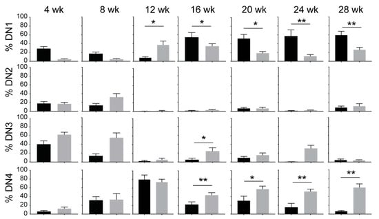 IL-15 deficiency in NOD.Scid mice yields the progression of DN thymocytes to the DN4 stage. Proportion of DN1 (CD44+CD25-), DN2 (CD44+CD25+), DN3 (CD44-CD25+) and DN4 (CD44-CD25-) subsets defined by CD25 and CD44 expression in NOD.Scid (black bars) and NOD.Scid.Il15−/− (gray bars) mice. n = 4–8 mice per group. Mean and standard deviation (SD) are shown. Statistical significance was calculated using Mann–Whitney’s test. * p > 0.05; ** p > 0.01.