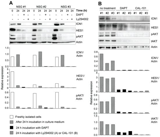 The PI3K/AKT signaling pathway, which synergizes with NOTCH activation to promote T cell development, can confer resistance to gamma secretase inhibitors in T-ALL []. Elevated basal levels of phospho-AKT in primary leukemic cells from NOD.Scid.Il15−/− and C57BL/6.Scid.Il15−/− mice (Figure 5A,B) suggested that these cells relied on both the NOTCH and PI3K/AKT pathways for leukemogenesis. The rapid reduction in pAKT levels with a discernible decrease in actin levels within 24 h of culture (Figure 5A) indicates that the primary leukemic cells require survival signals that are unavailable in the current in vitro culture conditions. At least a part of these survival signals emanates from PI3K and NOTCH1 signaling, as the inhibition of either of these pathways accelerates the reduction in actin levels (Figure 5B). We also observed that DAPT inhibited AKT activation in primary leukemic cells, but not in the pre-leukemic stage or in the established leukemic cell lines (Figure 5A,B and Figure 6, Supplementary Figure S3C). These results point towards potential crosstalk between deregulated NOTCH1 signaling and the PI3K/AKT pathway in promoting T-ALL development and a possible gain of constitutive AKT activation occurring during the establishment of cell lines in vitro.