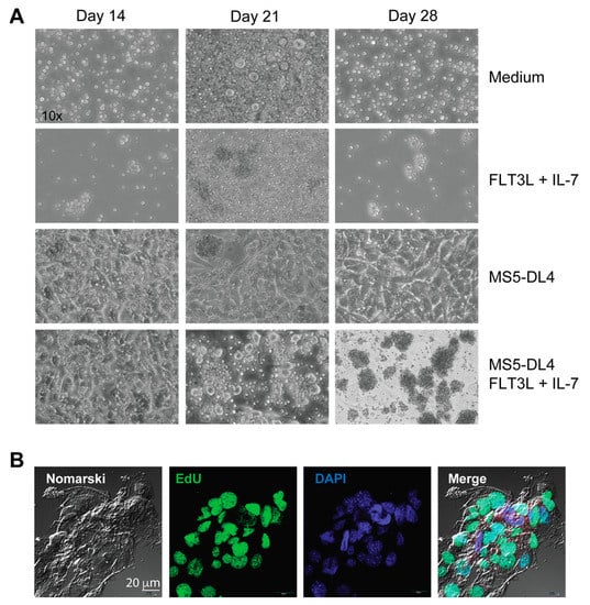 In addition to deregulated NOTCH1 activation, the PI3K/AKT signaling pathway, presumably activated by cytokines and growth factors produced by thymic stromal cells in vivo, can provide survival signals to potentially leukemogenic thymocytes arising in IL-15-deficient Scid mice and promote the outgrowth of leukemic cells. To test whether stromal cells can sustain the growth of leukemogenic cells in vitro, we used MS5 stromal cells expressing NOTCH1 ligand Delta-like 4 (MS5-DL4), which has been shown to sustain the viability of SCLtgLMO1tg pre-leukemic stem cells and permit the transition of DN3 thymocytes to DP cells []. MS5-DL4 cultures at a confluency of 80–90% were irradiated to prevent their growth before seeding the leukemic cells isolated from NOD.Scid.Il15−/− mice. In one set of co-cultures, FLT3 ligand (FLT3L) and IL-7 were added to provide additional survival signals. Total thymocytes from NOD.Scid mice or non-leukemic NOD.Scid.Il15−/− mice failed to survive beyond 7 days when cultured without the MS5-DL4 feeder cells. A few leukemic cells continued to survive for up to 28 days, either alone or in the presence of IL-7 and FLT3L, although the latter cultures showed clusters of proliferating cells (Figure 7A). Co-culture with MS5-DL4 cells alone did not cause any appreciable change in cell numbers, whereas the addition of Flt3 ligand and IL–7 induced a marked proliferation of these cells as seen from marked clustering, followed by massive expansion, as observed after 28 days of culture (Figure 7A). The leukemic cells became tightly adhered to feeder cells and all cells could not be dislodged by simple pipetting, making quantitation of cell expansion difficult. However, EdU staining at day 21 after co-culture indicated that the leukemic cells were undergoing rapid proliferation (Figure 7B). These results indicate that cytokine-driven survival signals play a crucial role in expanding leukemogenic thymocytes with aberrant NOTCH1 activation that arise in IL-15-deficient Scid mice.