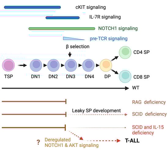 During intrathymic T lymphocyte development, CD4−CD8− double-negative (DN) precursors require distinct signals for progression through the DN1 to DN4 stages and to become CD4+CD8+ double-positive (DP) cells [,,]. Whereas cell proliferation and the DN1 to DN2 transition require signaling via KIT, IL-7R and NOTCH1 receptors, subsequent transition through the DN3 checkpoint selects thymocytes that express productively rearranged TCRβ, which combines with an unrearranged pre-TCRa chain to generate a signaling competent pre-TCR []. This ‘β-selection’ process enables pre-TCR signaling, allowing DN3 cells to traverse through the DN4 stage and become DP cells, which undergo positive and negative selection processes to generate CD4+ or CD8+ single-positive (SP) naïve T lymphocytes. T cell development is controlled by several transcription factors (TFs) that are turned on or off in a tightly regulated manner [,]. The aberrant activation of these TFs, such as LMO2/LYL1, HOXA, TLX1/3, NKX2 and TAL1, contributes to the pathogenesis of T-ALL [,,]. Their activation mainly occurs via chromosomal translocation at the TCR locus through illegitimate recombination events that occur during the TCR-gene-rearrangement process [,]. Transgenic mouse models expressing these oncogenic TFs are widely used to elucidate the molecular pathogenesis of T-ALL. Other tumor-associated aberrant signaling pathways that frequently occur in human T-ALL arise from activating mutations in genes such as NOTCH1 (>60%), IL-7R, JAK/STAT, K–RAS and N–RAS, and inactivating mutations in PTEN and CDKN2A/2B (>70%) [,,].