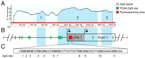 Localization of identified CpG islands and TCGA CpG sites in the region of interest of the genomic SFRP1 sequence (exon 1 and 1000 bp upstream). (A) Three identified CpG islands by default criteria of CpG island size > 100 bp, CG percentage > 50% and observed to expected CpG ratio > 60%. CpG islands are labelled in blue and numbered upstream to downstream (1–3) in the schematic SFRP1 gene map. (B) Additionally, positions of 14 CpG sites from the TCGA pancreatic cancer data set are labelled in green in the region of interest. Black line indicates promoter region upstream of transcription start site (TSS) as well as intronic sequence downstream of exon 1. The box indicates exon 1, including its grey marked 5′UTR (TLS denotes the translation start site). Note that seven CpG sites are covered by CGI2 (island 2 CpGs). The red box represents the area for methylation analysis, which is located in the 5′UTR of the first exon. (C) The area for methylation analysis (pyrosequencing assay) contains 11 selected CpG sites (numbered upstream to downstream, 1–11).