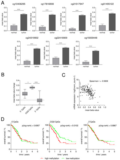 In silico analysis of SFRP1 promoter methylation in primary pancreatic cancer shows significantly higher DNA methylation at specific CpG sites (CGI2) in tumor vs. normal tissue with potential clinical impact. (A) Mean methylation status of all specific CpG sites is significantly higher in tumor (n = 184) vs. normal tissue (n = 10) (Mann–Whitney U test, **** p < 0.0001). (B) Mean methylation change of CGI2 CpGs is significantly higher than that of 5’CpGs (Dunn’s test, * p < 0.05) and 3’CpGs (Dunn’s test, **** p < 0.0001). (C) Inverse correlation of mean CGI2 CpGs methylation status and SFRP1 mRNA expression in primary pancreatic tumors (n = 178, Spearman r = −0.582). (D) Kaplan–Meier analysis in dependence of pancreatic cancer patients’ overall survival and their SFRP1 DNA methylation status dichotomized by the median in high (red) and low (green) methylation. Left and right: no significant difference of overall survival between high vs. low methylation status of 5’CpGs (median beta value = 0.31, log-rank test, ns p = 0.6907) and 3’CpGs (median beta value = 0.56, log-rank test, ns p = 0.8867). Middle: significantly longer overall survival with low vs. high methylation status of CGI2 CpGs (median beta value = 0.37, log-rank test, * p = 0.0102).