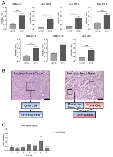 Tissues of pancreatic adenocarcinomas consist not only of tumor cells but also of connective tissue cells [28]. As DNA was isolated by macrodissection, there might be a potential impact of impurities of connective tissue cells on the DNA methylation analysis (Figure 3B). Therefore, we investigated the DNA methylation status of macrodissected connective tissues of five pancreatic adenocarcinoma samples as well. We found that the mean methylation status for the CpG sites 1–7 ranges from 0.05 to 0.21 and that the methylation pattern is comparable to the one of pancreatic normal acinar cells (Figure 2C).
