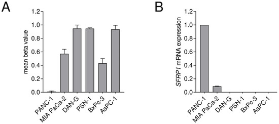 Finally, the CGI2 methylation status was analyzed in a set of pancreatic cancer cell lines, where impurities of connective tissue cells can be excluded, as exclusively pure cancer cells are present. The DNA methylation status of the eleven selected CpG sites of CGI2 was investigated (Figure 1C). We found a high mean DNA methylation status for the cell lines DAN-G, PSN-1 and AsPC-1 with 0.94 to 0.95 and a medium status for the cell lines MIA PaCA-2 and BxPc-3 with 0.57 and 0.43, respectively. Interestingly, we found that the PANC-1 cell line, commonly used in pancreatic cancer research, does not show SFRP1 promoter methylation at CGI2 (Figure 4A). Additionally, we analyzed the SFRP1 mRNA expression of all cell lines and detected negligible SFRP1 mRNA expression in DAN-G, PSN-1, AsPC-1 and BxPc-3 cells, while we measured relatively abundant SFRP1 mRNA expression in PANC-1 cells and compared to that relatively low SFRP1 mRNA expression in MIA PaCa-2 cells (Figure 4B). We observed an inverse trend between mean CpG island 2 methylation status and SFRP1 mRNA expression, but the p-value was not significant in this small cohort of pancreatic cancer cell lines (n = 6, Spearman r = −0.7714, ns p = 0.1028).