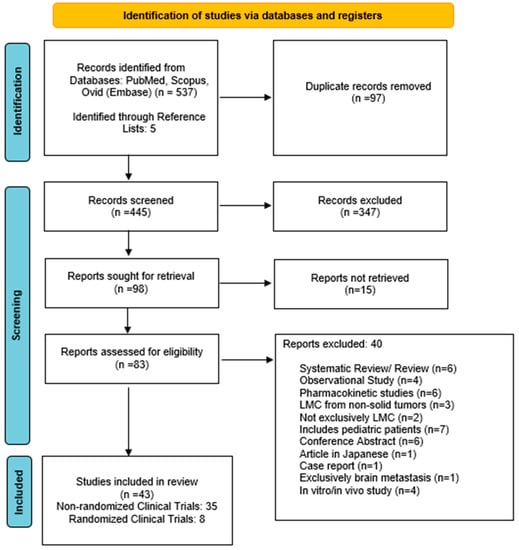 The systematic review of the literature was registered in the International Platform of Registered Systematic Reviews and Meta-Analysis Protocols (INPLASY), INPLASY2022120112, and conducted adhering to the Preferred Reporting Items for Systematic Reviews and Meta-Analysis (PRISMA) guidelines and recommendations [6]. PubMed, Scopus, and Ovid (Embase) were queried without restrictions of publication language. The search terms “Leptomeningeal Carcinomatosis” OR “Carcinomatous Meningitis” OR “Leptomeningeal Metastasis” OR “Neoplastic Meningitis” AND “Clinical Trial” were used to search these databases from inception to December 2022. Additional publications were identified from the reference list of selected papers.