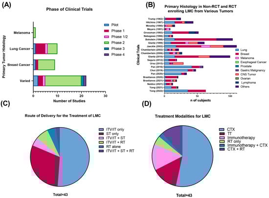 Forty-three clinical trials published between 1982–2022 were included in the qualitative synthesis. The majority consisted of non-randomized (n = 35, 81.4%), phase I (n = 7, 16.3%), or phase II (n = 28, 65.1%) clinical trials (Figure 2A). Lung (25%) and breast cancer (22.5%) were the most frequent primary histology in trials enrolling LMC from a specific primary histology. There was only a single, non-randomized phase II clinical trial focused on evaluating multimodality treatment for LMC from melanoma (n = 1, 2.4%) [8]. A total of 23 trials (57.5%) enrolled patients with LMC from diverse primary tumors, where breast (35.4%), lung (31.4%), and other (14%) were listed as the most common types of histology (Figure 2B).