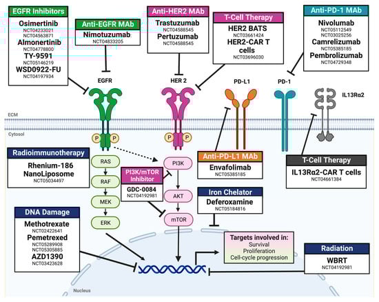 Mechanisms of action for drugs for actively enrolling clinical trials for leptomeningeal carcinomatosis. Abbreviations: Mab: monoclonal antibody; BATS: bi-armed activated T-cells; RT: radiotherapy; WBRT: whole-brain radiotherapy. NCT number: ClinicalTrials.gov identifier.