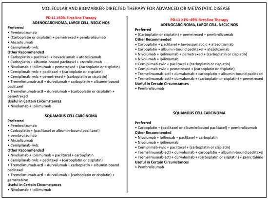In any case, the advent of immunotherapy has significantly improved progression-free survival (PFS), overall survival (OS), and the patient’s quality of life in comparison to chemotherapy. In pretreated advanced NSCLC, administration of nivolumab or atezolizumab has shown improved clinical outcomes compared to chemotherapy [8]; similarly, Pembrolizumab administered for two years maximum, showed better results in both treatment-naïve and pretreated patients [9,10]. In addition, in the first-line setting, the ipilimumab/nivolumab combination has significantly increased PFS and OS in advanced NSCLC patients followed up for two years [11,12]. Based on these results, the Food and Drug Administration (FDA) and the European Medicines Agency (EMA) approved ICIs for first-line treatment of advanced NSCLC. Currently, several ICIs are recommended by international guidelines in accordance with PD-L1 expression levels (Figure 1, https://www.nccn.org, accessed on 15 January 2023). With the introduction in the daily practice of ICIs and the raising of the 5-year OS rates, the number of long-term survivors has increased, as reported in several clinical trials like CheckMate 003, CheckMate 057 and 017, and KEYNOTE 001 [13,14,15]. In these trials, long-term survival was achieved in more than 15% of patients (vs. 5% in the pre-immunotherapy era); however, the optimal duration of immunotherapy remains to be established. While in earlier studies, the treatment was administered until disease progression or unacceptable toxicity, in more recent trials, an administration limit of two years was introduced. Real-world data on ICIs discontinuation are limited, and only a single randomized phase IIIb/IV trial has been published to date [16].