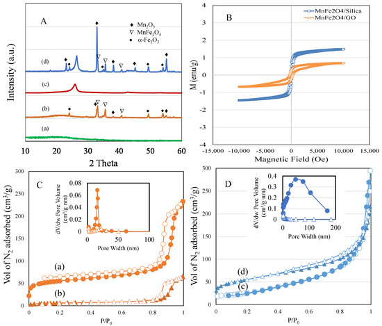 (A) (a–d). XRD powder patterns of: (a) silica; (b) MnFe2O4/silica; (c) GO; and (d) MnFe2O4/GO. (B) Vibrating sample magnetometer spectrum of MnFe2O4/silica and MnFe2O4/GO. (C) (a,b). BET adsorption–desorption isotherm and pore size distributions of: (a) silica; and (b) MnFe2O4/silica. (D) (c) GO; and (d) MnFe2O4/GO. Closed symbol represents adsorption and open one represents desorption.