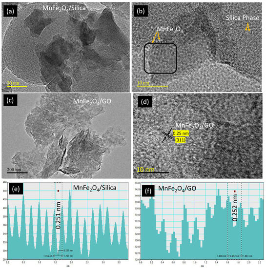 The morphological difference of MnFe2O4 loading over silica and graphene was analyzed using high resolution transmission electron microscope (HRTEM) (Figure 2a–d). The spherical silica was uniformly dispersed with a diameter of 80 nm, while spinel ferrite nanoparticles (10–20 nm) dispersed across thessilica (Figure 2a,b). The graphene oxide is presented with a thick sheet texture in its un-agglomerated form [24] (Figure 2c,d). The lattice fringes with interplanar distance of 0.25 nm corresponding to (311) plane measured over nanoparticle confirmed the presence of cubic MnFe2O4 over the two different supports.