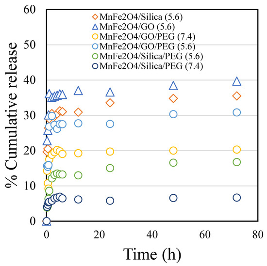 The percentage cumulative cisplatin release in pH 5.6 and 7.4 conditions for 72 h from: MnFe2O4/silica pH 5.6 (orange diamond); MnFe2O4/GO pH 5.6 (blue triangle); MnFe2O4/GO/PEG pH 7.4 (yellow circle); MnFe2O4/GO/PEG pH 5.6 (blue circle); MnFe2O4/silica/PEG pH 5.6 (green circle); and MnFe2O4/silica/PEG pH 7.4 (dark blue circle).