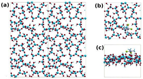 (a) A 2 × 2 supercell of the silica system; (b) top; and (c) side views of the cisplatin–silica structure.