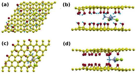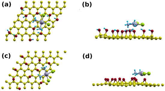 Cisplatin can bind to a single layer or multilayer GO structure. With the latter, cisplatin can further intercalate between the layers, thus creating a sandwich structure. We modeled this system using 6 × 6 GO supercell, with two limiting GO models, one with hydroxyl groups (GO1) and the other with epoxy groups (GO2). Structures with cisplatin on single layer GO are shown in Figure 5. We placed the drug about 3 Å above each GO layer. A few electrostatic H bonds were formed between the H atoms of the cisplatin and the hydroxyl groups of GO1 (Figure 5a,b) and the epoxy groups of GO2 (Figure 5c,d), resulting in average bonds lengths of about 1.9 and 2.0 Å, respectively. This resulted in binding energies of 1.47 eV and 1.46 eV, respectively.