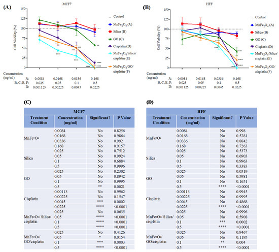 MTT cell viability assay on: (A) MCF7; and (B) HFF cell lines. Cells were treated with the following conditions for 48 h: MnFe2O4, silica, GO, Cisplatin, Cisplatin/silica/MnFe2O4 and Cisplatin/GO/MnFe2O4; (C,D) treatment concentrations and statistical analysis for MCF7 (C); and HFF (D). Different treatment concentrations were used for MnFe2O4 and cisplatin to reflect the actual concentration adsorbed on the nanocomposite. For details, please see the Materials and Methods section. N = 4 independent experiments. Dashed line represents untreated cells, control. * p < 0.05; ** p < 0.01; *** p < 0.001; **** p < 0.0001 versus control using two-way ANOVA with Dunnett’s post hoc testing.