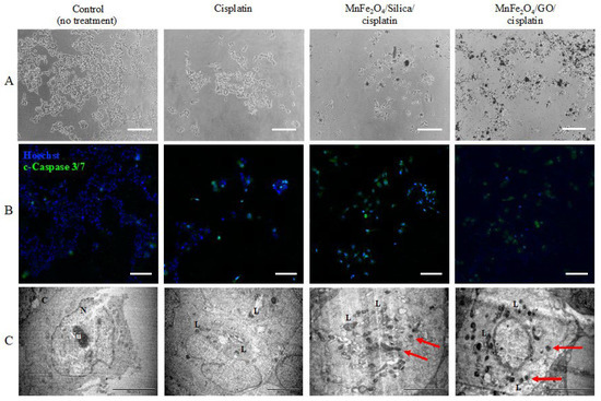 Apoptotic effect of different treatment conditions on MCF7. Cells were treated with cisplatin, MnFe2O4/silica/cisplatin, and MnFe2O4/GO/cisplatin for 48 h. The highest dose of each condition was used as follows: cisplatin was 0.0225 mg/mL; MnFe2O4/silica/cisplatin, and MnFe2O4/GO/cisplatin was 0.5 mg/m: (A) brightfield images (scale bar is 200 µm); (B) immunofluorescence images of cells stained with cleaved-Caspase 3/7 (green) and Hoechst (blue) (scale bar is 100 µm); and (C) TEM images of treated cells (scale bar is 5 µm). N: nucleus; Nu: nucleolus; Cy: cytoplasm; L: lysosome vacuoles: red arrow: Nanoparticle penetration. Images in A and B are not from the same field of view.